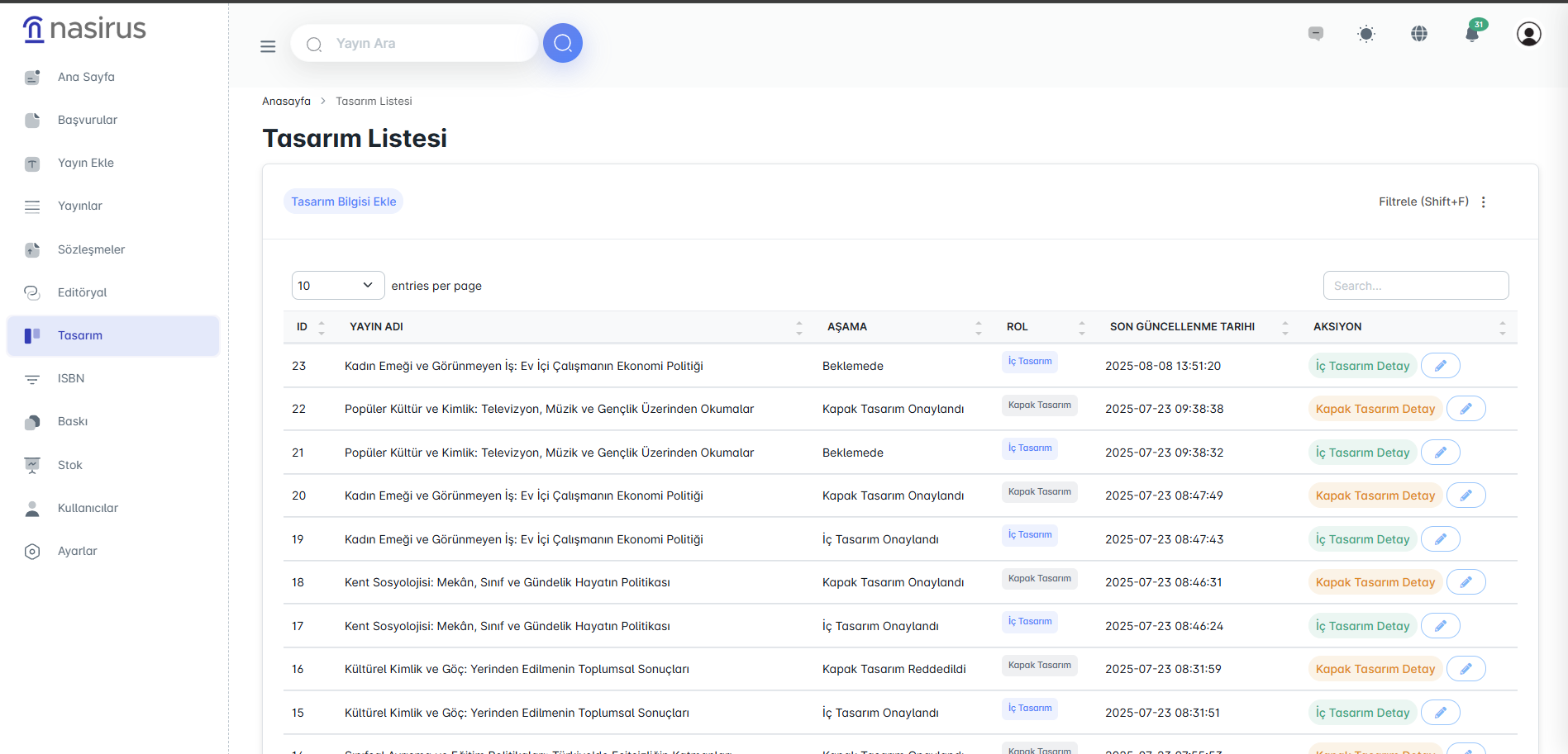 Bu ekran, tüm yayınlara ait tasarım süreçlerini listelemektedir. Yayınların aşamaları (ör. kapak tasarımı, iç tasarım) ve bu aşamalardaki güncel durumlar görüntülenir. Yöneticiler buradan tasarım süreçlerini takip edebilir, ilgili detay ekranına geçiş yaparak süreci yönetebilirler.