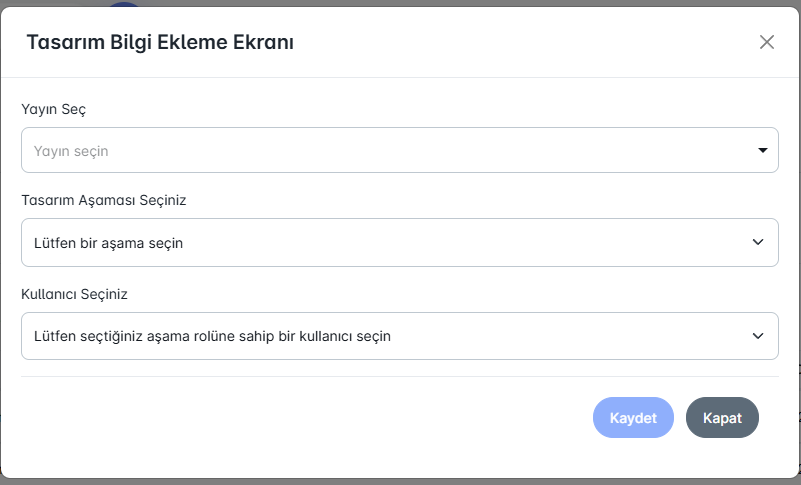Bu alan, yeni bir tasarım süreci başlatmak için kullanılmaktadır. İlgili yayın seçildikten sonra, tasarım aşaması (kapak veya iç tasarım) belirlenir ve süreci yürütecek kullanıcı atanır. Böylece her yayın için tasarım görevleri yetkin kişilere yönlendirilmiş olur.