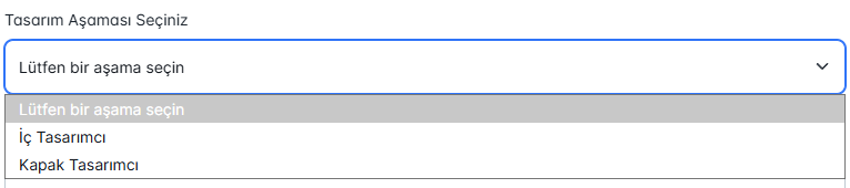 Burada, sürecin hangi tasarım alanına ait olduğu belirlenir. İç Tasarım ve Kapak Tasarım seçenekleri bulunmaktadır. Böylece her görev, uzmanlık alanına göre ayrıştırılarak doğru kullanıcıya atanır.