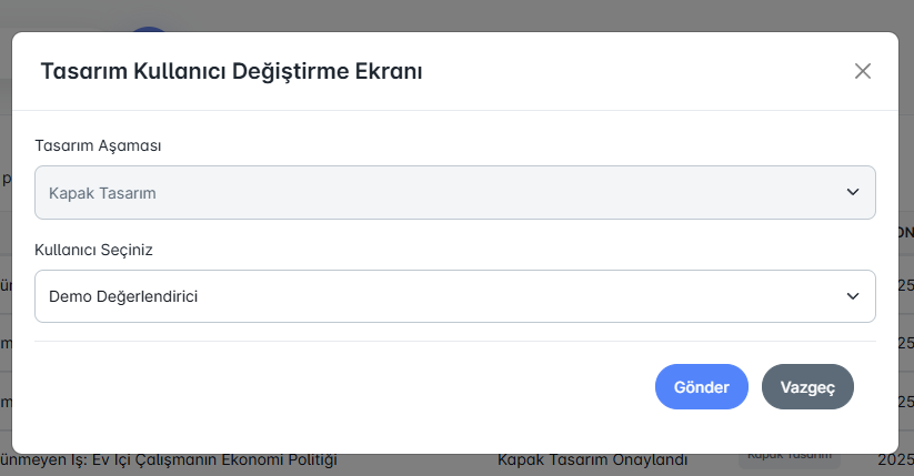 Bu ekran, daha önce atanmış bir tasarım görevinde kullanıcı değişikliği yapılmasını sağlar. Örneğin, kapak tasarım süreci bir kullanıcıdan alınarak başka bir tasarımcıya aktarılabilir. Böylece esneklik sağlanır ve süreç kesintisiz devam eder.