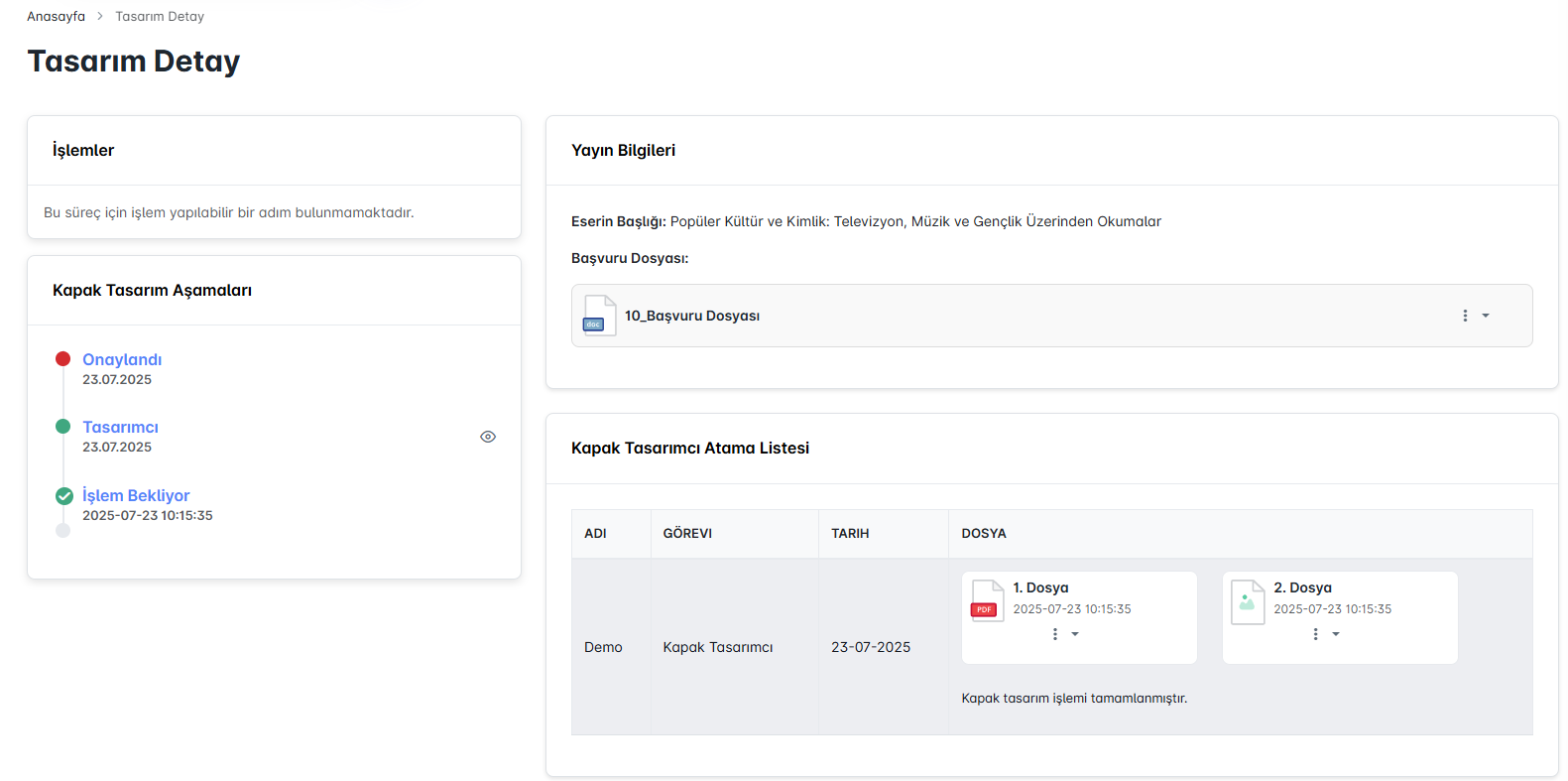 Detay ekranında, seçilen yayın için tasarım sürecinin tüm aşamaları görüntülenir. Kapak veya iç tasarımın hangi tarihte, kim tarafından yürütüldüğü ve yüklenen dosyalar açıkça görülebilir. Yöneticiler, burada tasarımcı tarafından yüklenen dosyaları inceleyebilir ve onay, red veya düzeltme seçenekleriyle süreci yönlendirebilir.
