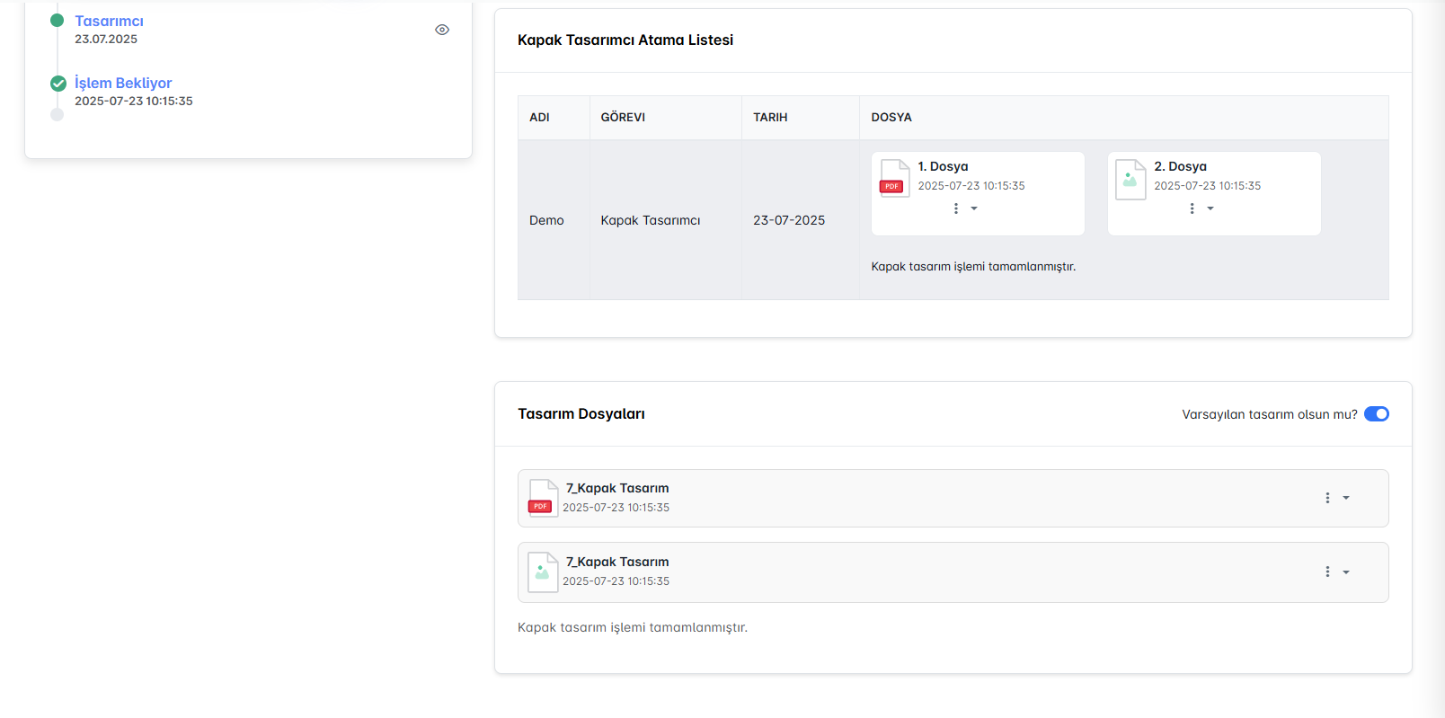 Bu bölümde, kapak tasarımına atanmış kullanıcılar ve bu kullanıcıların yükledikleri dosyalar yer alır. Dosyalar farklı formatlarda (ör. PDF, görsel) yüklenebilir ve her yükleme tarih bilgisiyle birlikte kayıt altına alınır. Ayrıca “Varsayılan tasarım” seçeneği ile belirli bir tasarımın son hali resmileştirilebilir.