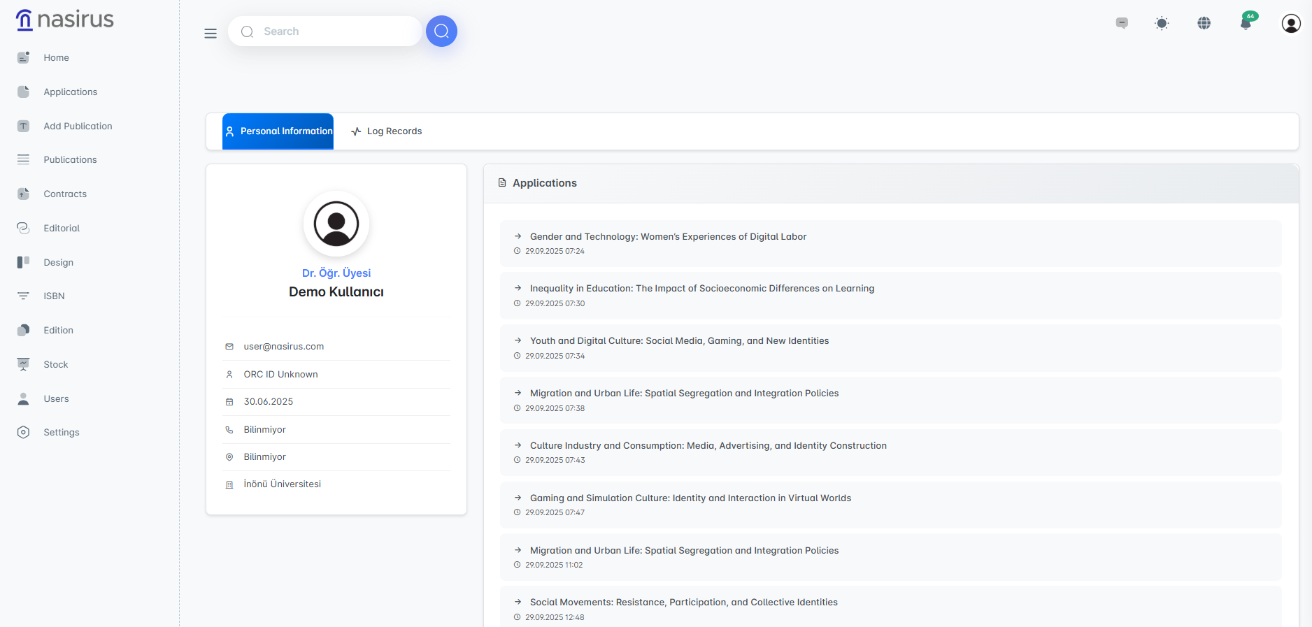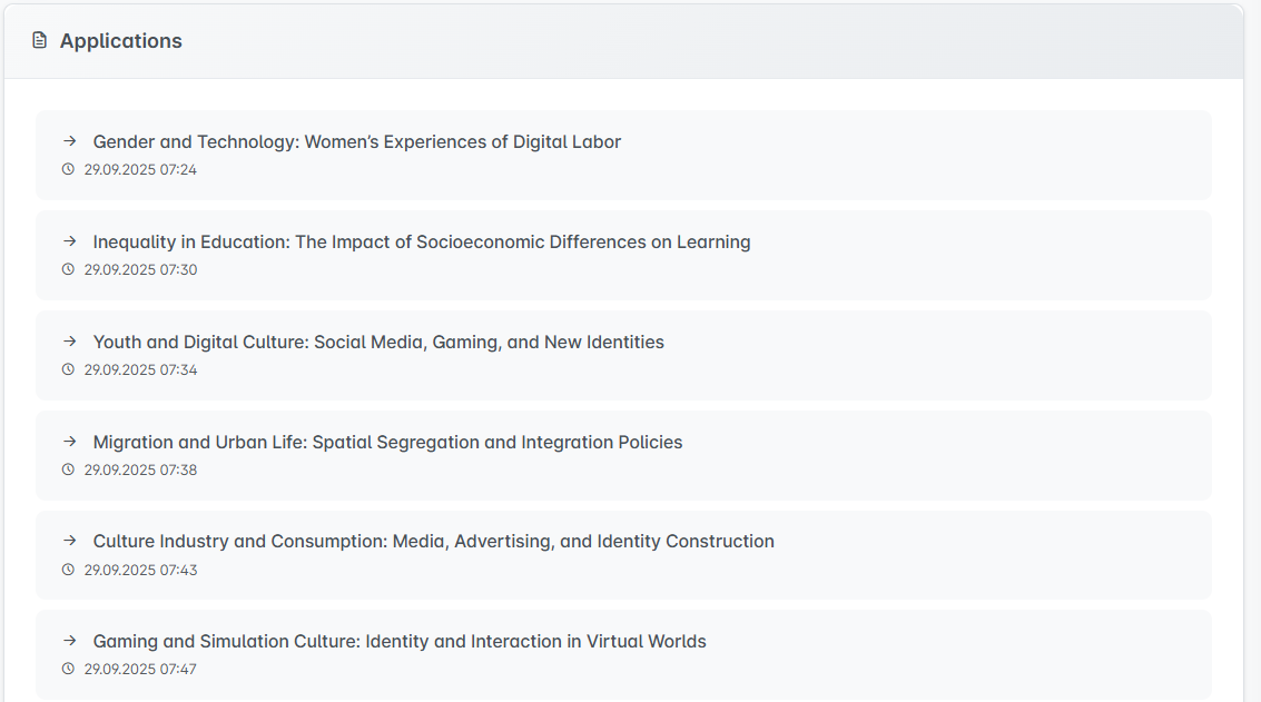 When accessing the Profile screens, much more comprehensive information about the user is presented. On the left side, the user’s identity information (such as first name, last name, title, email, and institution details) is displayed. On the right side, the applications submitted by the user are listed. These applications are shown along with date and time information, contributing to the transparency and traceability of the processes.