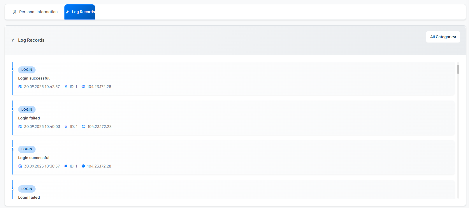 Finally, in the Log Records tab, the complete history of all actions performed by the user is listed. In particular, the approval or rejection status of contracts is recorded along with the relevant timestamps, IP addresses, and transaction IDs. This structure ensures that user activities are documented, providing the necessary transparency for auditing and security purposes.