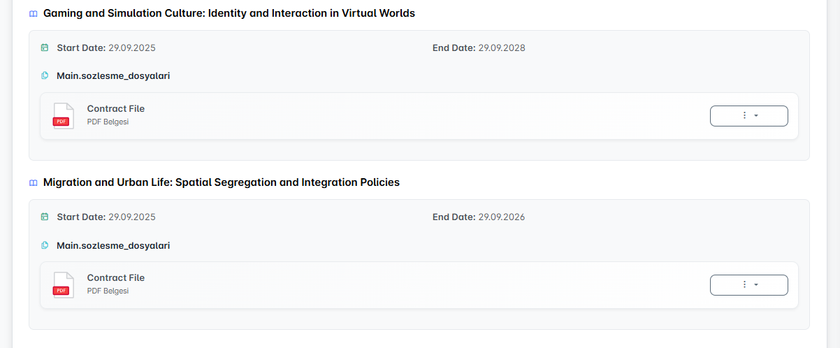 In the next section, the publications the user is involved in are displayed. The titles of the publications are listed, and the relevant contract information is also presented in detail. Here, the start and end dates of contracts, as well as any uploaded contract files, can be reviewed.