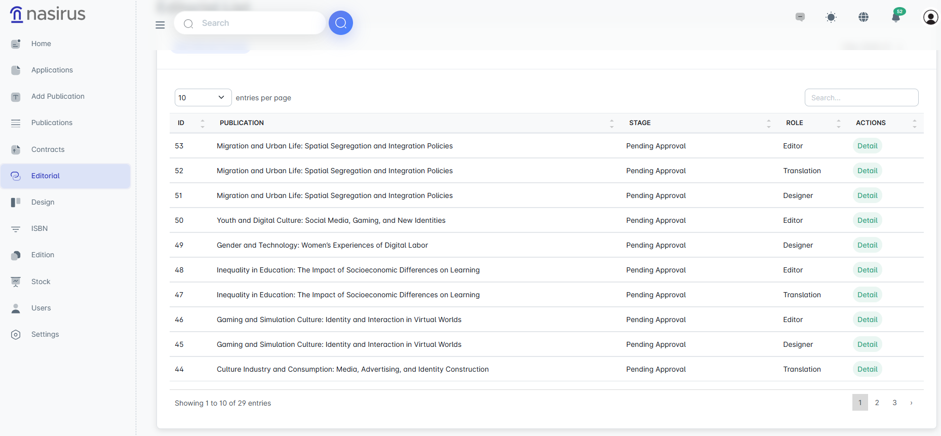 This screen displays the editorial processes carried out for publications. The publication title, current stage, relevant role (editor, illustrator, translator, etc.), and available actions can be viewed. Administrators can track the stage of each process and access detailed information from here.