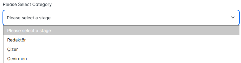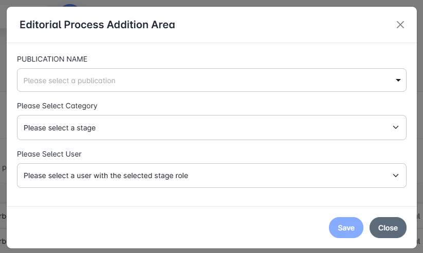 Administrators can define a new editorial process from this screen. After selecting the publication, the relevant category (editor, illustrator, translator) and the user who will take on this role are assigned. This officially initiates the process