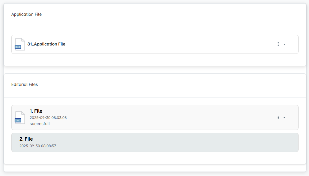 Detailed information is displayed for the selected publication within the editorial process. The process stages are presented in a timeline format, allowing clear tracking of which actions have been completed and which are pending. Additionally, the relevant editorial files and the status of users' actions are also recorded here.