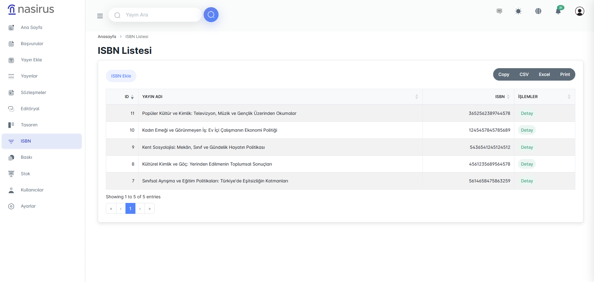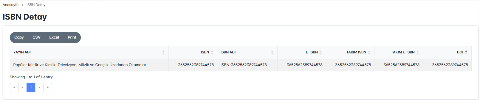 Ayrıca ISBN listesi, Copy, CSV, Excel formatlarında dışa aktarılabilir veya doğrudan yazdırılabilir. Bu sayede yayınların ISBN bilgileri kolayca raporlanabilir ve arşivlenebilir.