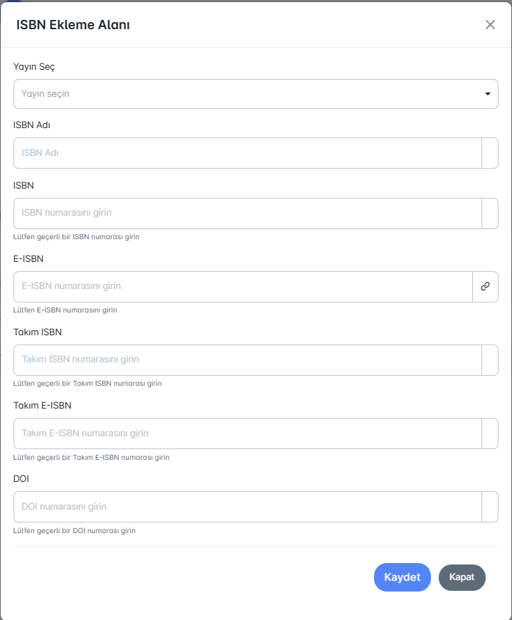 ISBN modülü, yayınların uluslararası standart numaralarının sisteme kaydedildiği ve yönetildiği alandır. Yöneticiler buradan ISBN, E-ISBN, Takım ISBN, Takım E-ISBN ve DOI bilgilerini ekleyebilir.