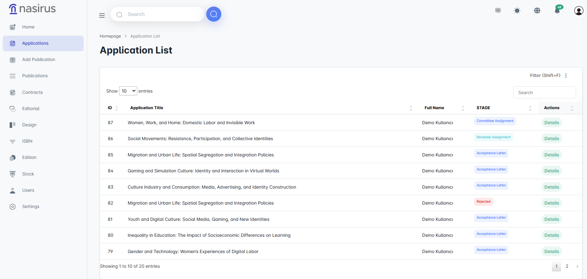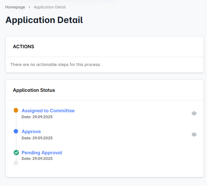 All applications submitted by users are listed here. The stage of each application (rejected, committee approval, reviewer approval, etc.) and the related actions can be easily tracked.