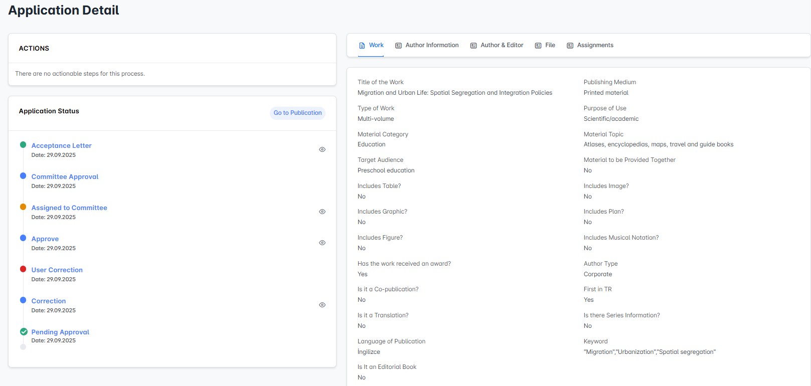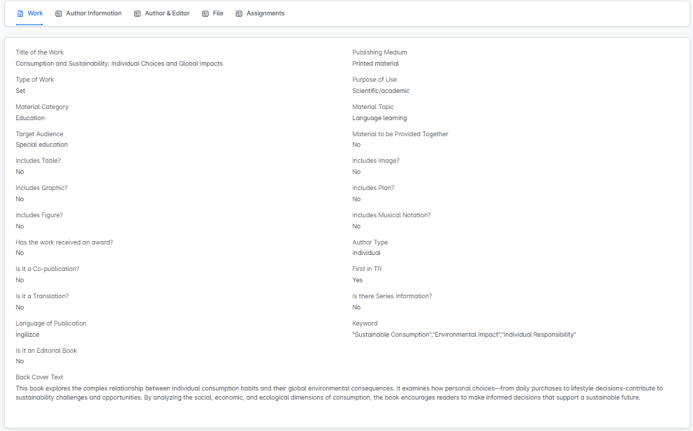 This tab contains detailed information about the work subject to the application. Key details such as the type of work, publication medium, material category, topic, and target audience are presented to the user.