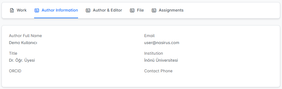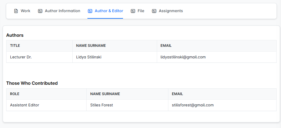 This tab contains the name, surname, title, institution, and contact information of the author who submitted the application. Academic identification data, such as ORCID information, can also be viewed here.
