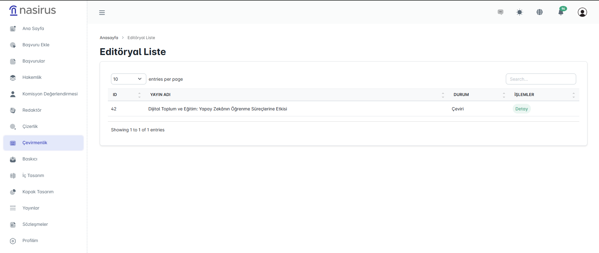 Bu ekranda çevirmenin üzerine atanan yayınların listesi bulunur; burada yayının adı, mevcut durumu ve işlem seçenekleri görüntülenir. Çevirmen ilgili yayını seçerek detay ekranına geçer.