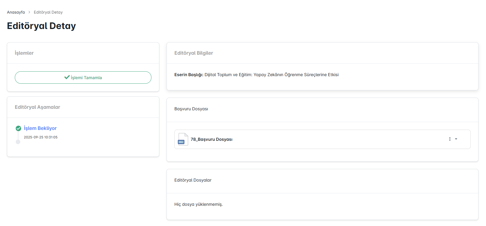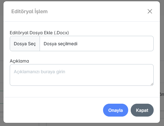 “Editöryal İşlem” ekranında, çevirmen hazırladığı çeviri dosyasını sisteme yükler ve açıklama kısmına yapılan çalışmaya dair kısa bir not ekler. Bu açıklama, çevirinin kapsamı, kullanılan yöntem veya özel dikkat gerektiren noktalar hakkında yöneticiyi bilgilendirmeyi sağlar. Dosya onaylandığında sistemde kayıt altına alınır ve yayın sürecinin sonraki aşamalarına aktarılır.
