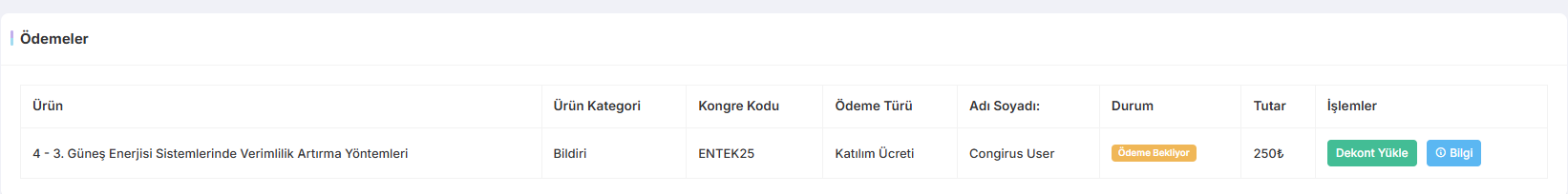 Ödemeler sayfasında, katıldığınız kongre için ödediğiniz ücreti belgeleyen dekontu yükleyerek işleminize devam edebilirsiniz.