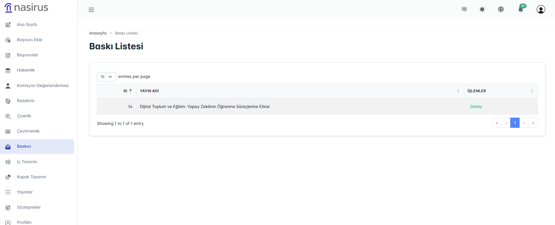 Baskıcı ekranı, eserin basım aşamasına geldiğini ve fiziksel üretim sürecine aktarılacağını gösterir. İlk ekranda baskıcıya atanan yayınların listesi yer alır; yayın adı ve işlem butonları üzerinden detay ekranına geçiş yapılır.