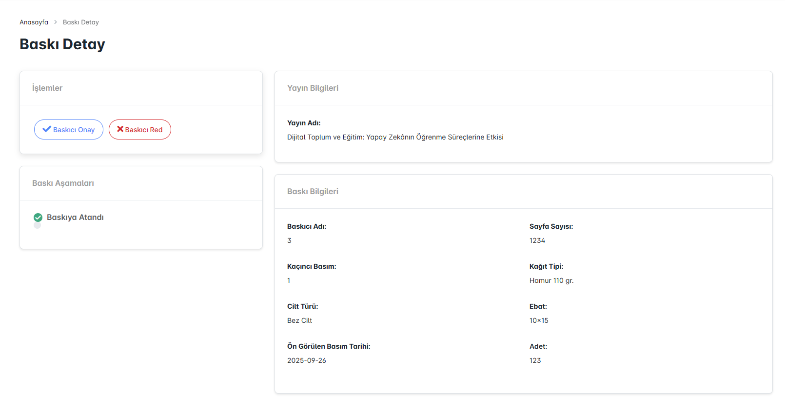 Baskıcı, süreci onaylamak için “Baskıcı Onay” butonunu, reddetmek için “Baskıcı Red” butonunu kullanır. Onay işlemi ile eser basım aşamasına geçirilir, reddetme durumunda ise ilgili yöneticiler sürece müdahale ederek eksiklikleri giderebilir. Bu yapı, yayınların basım öncesinde hem içerik hem de teknik açıdan tam hazır hale gelmesini sağlar.