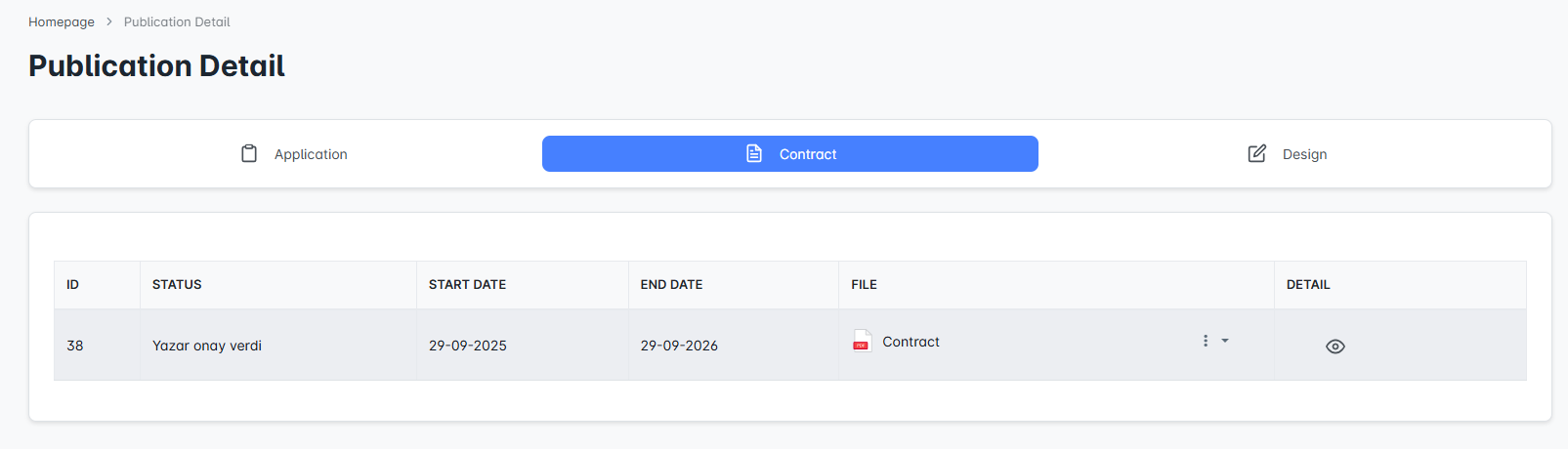 The contract information related to the publication is available in this section. You can track the status, dates, and files of the contract here.