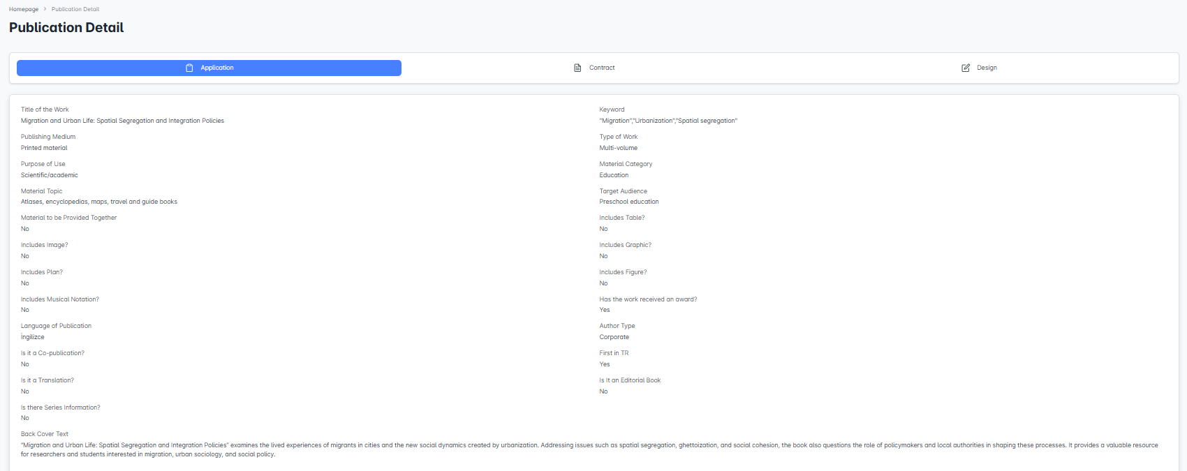 Here, all the application information entered for the publication is displayed in detail. You can check details such as the subject, language, and back cover text of the work.