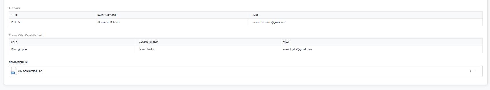 In this area, you can view the author and editor information of the publication along with the uploaded application file. All information is gathered on a single screen for easy access.