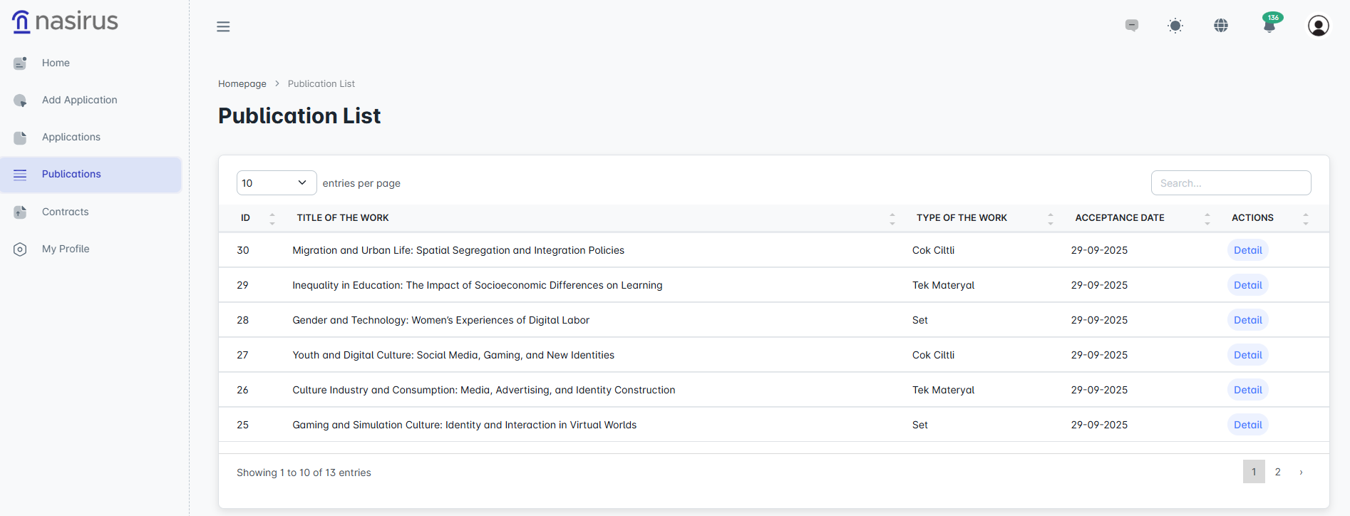 In this section, you can view all your accepted publications in a list and access basic information such as their type and acceptance date. By clicking the “Details” button, you can examine the processes of the publication.