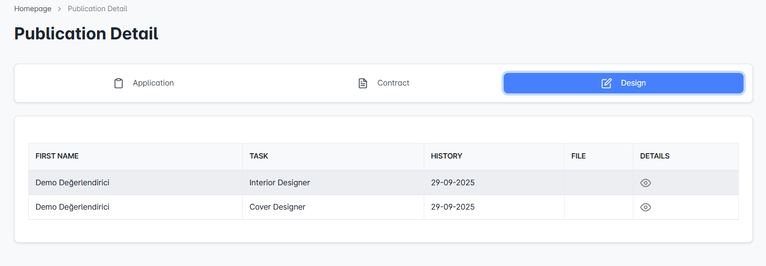 The personnel responsible for the design process, the uploaded files, and the dates are listed here. This allows you to easily track the cover and interior design processes.