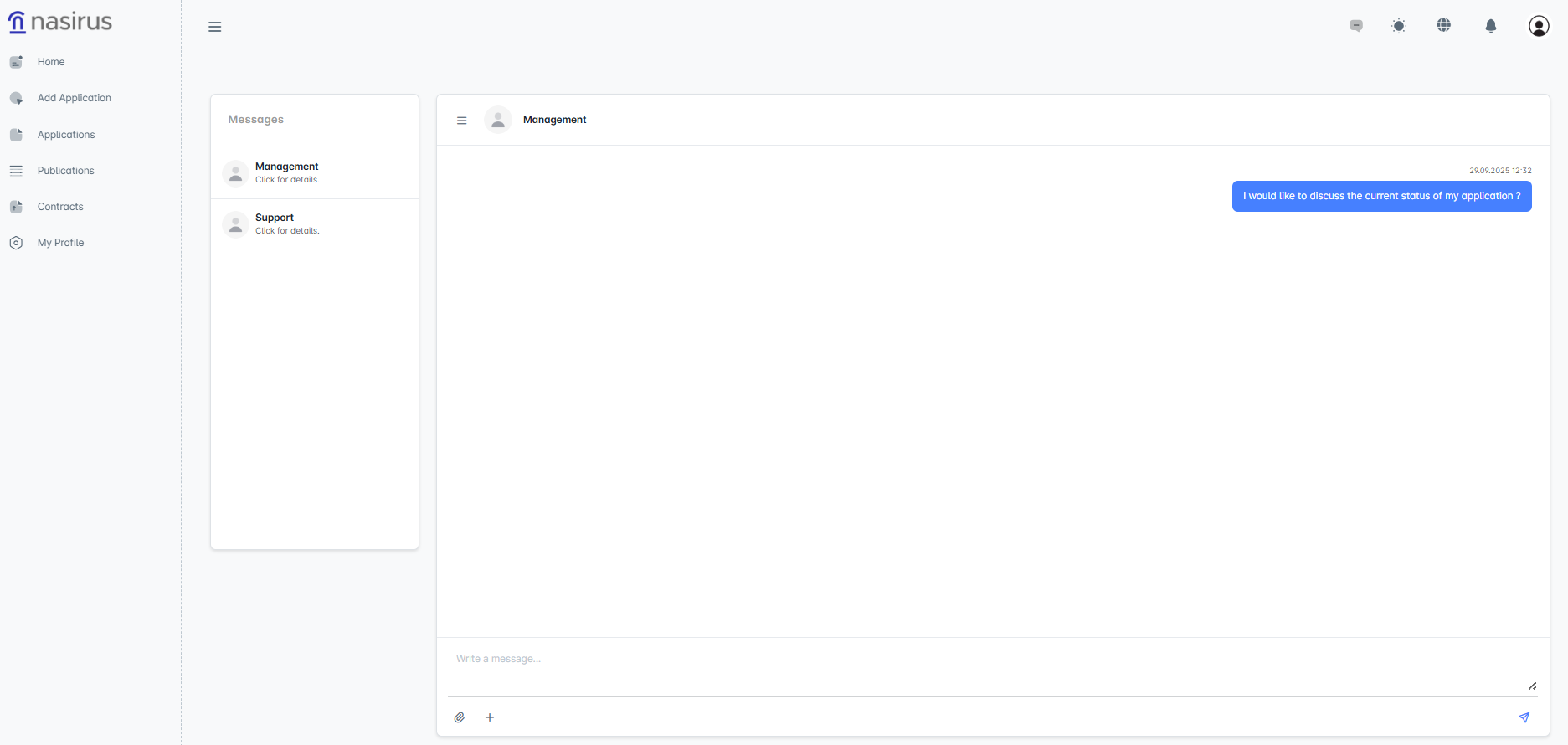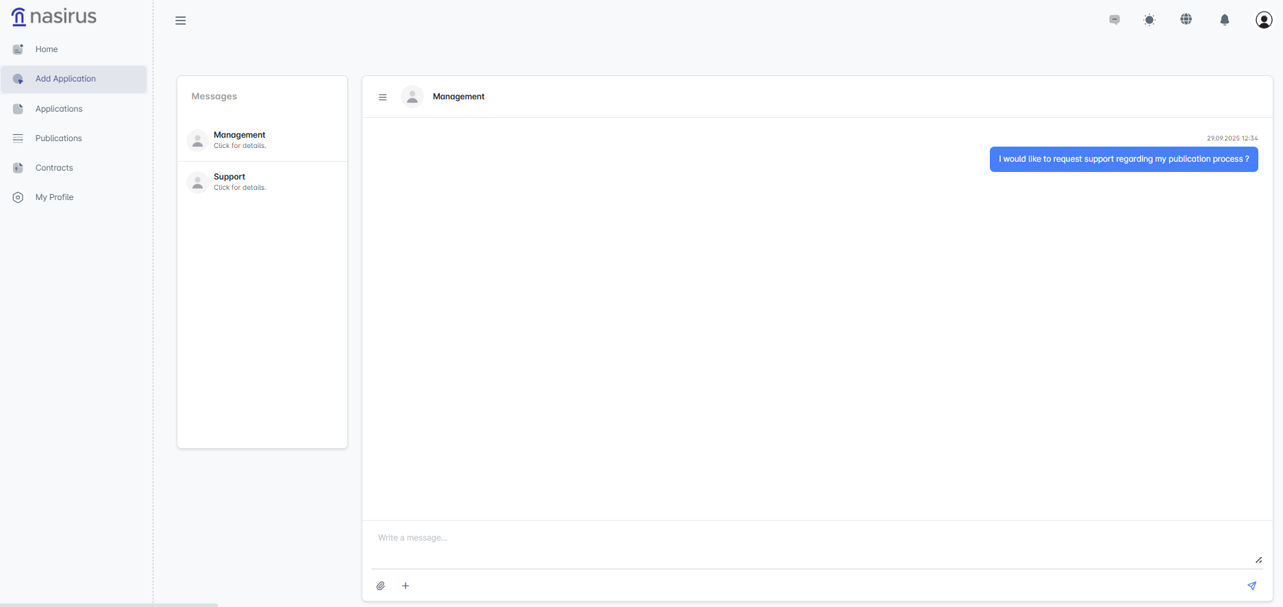The messaging area is designed to meet users' communication needs within the system. In this section, users have two main channels: Administration and Support. Messages sent to the Administration channel allow users to request direct information regarding application processes, evaluation status, or publication stages. The Support channel is used to provide assistance to users for technical issues, system usage, or general help inquiries.