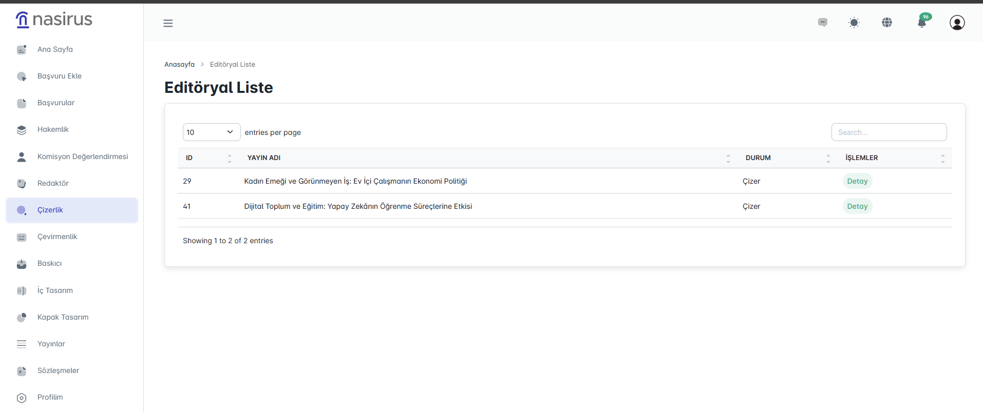 Bu ekranda çizerin üzerine atanan yayınlar listelenir. Yayın adı, mevcut durum ve işlem butonları (Detay) yer alır. Çizer buradan ilgili yayının detayına geçiş yapar.