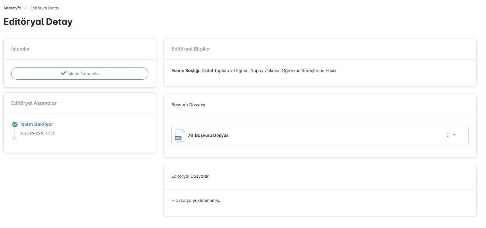 Detay ekranında eserin başlığı, başvuru dosyası ve daha önce yüklenmiş çizim dosyaları görüntülenir. Bu aşamada çizer, eserin içeriğini destekleyen veya kapak tasarımına katkı sağlayan çizimleri hazırlar. Gerekli dosyaları sisteme yüklemek ve açıklama eklemek için “Editöryal İşlem” ekranı kullanılır.