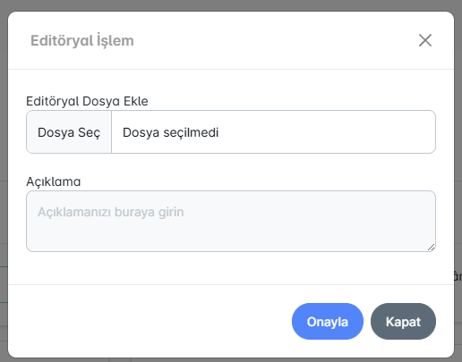 “Editöryal İşlem” penceresinde, çizer çizim dosyasını sisteme ekler ve dosyanın içeriğiyle ilgili kısa bir açıklama yazar. Açıklama, yapılan çizimin kapsamı veya kullanım amacı hakkında yöneticiyi bilgilendirmeyi sağlar. Dosya onaylandığında, ilgili çizim sisteme kaydedilir ve yayın sürecinin sonraki aşamalarına aktarılır.