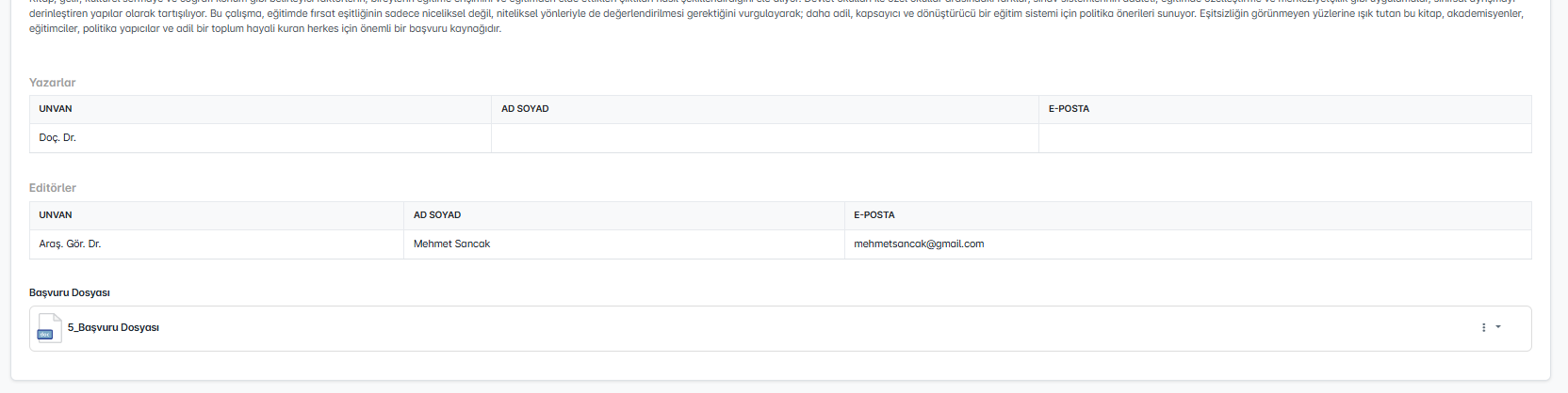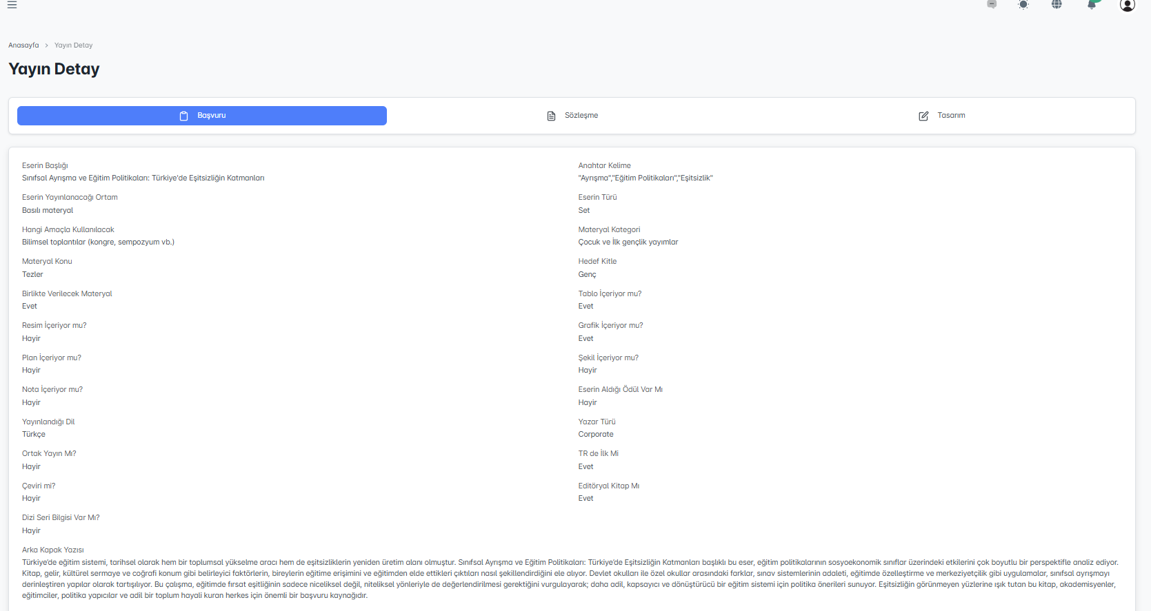 Burada yayın için girilen tüm başvuru bilgileri ayrıntılı şekilde görüntülenir. Eserin konusu, dili, arka kapak yazısı gibi detayları kontrol edebilirsiniz.