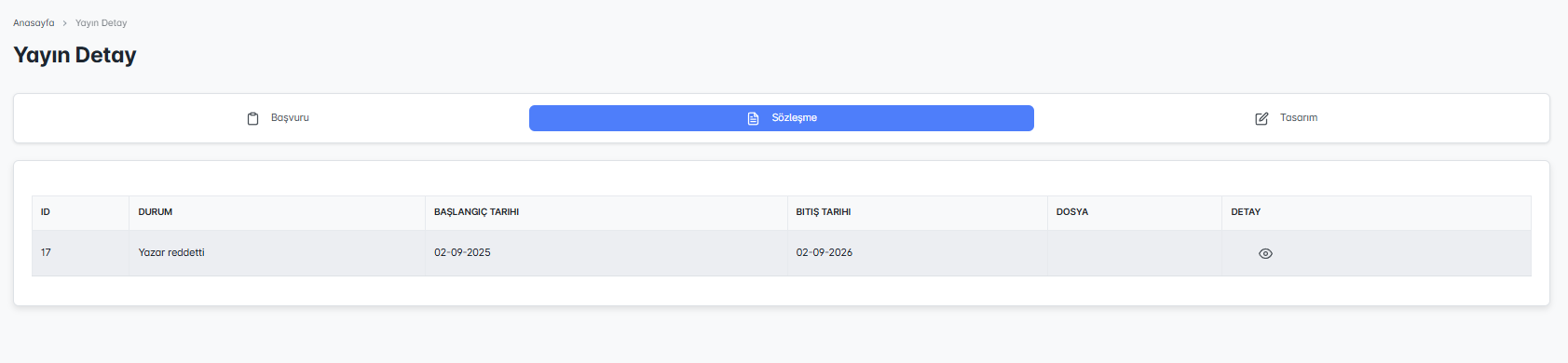 Yayına ait sözleşme bilgileri bu bölümde yer alır. Sözleşmenin durumu, tarihleri ve dosyaları buradan takip edebilirsiniz.