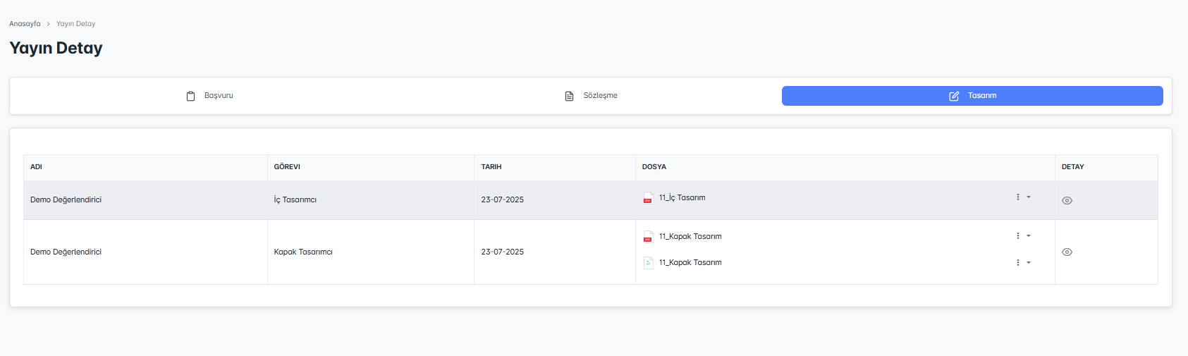 Tasarım sürecine dair görevli kişiler, yüklenen dosyalar ve tarihler burada listelenir. Böylece kapak ve iç tasarım süreçlerini kolayca takip edebilirsiniz.