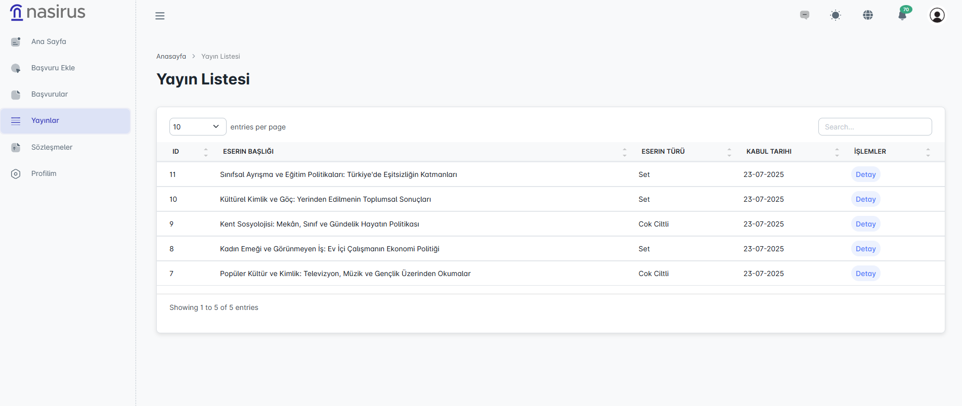 Bu bölümde kabul edilen tüm yayınlarınızı liste halinde görebilir, tür ve kabul tarihleri gibi temel bilgilere ulaşabilirsiniz. “Detay” butonuyla yayının süreçlerini inceleyebilirsiniz.