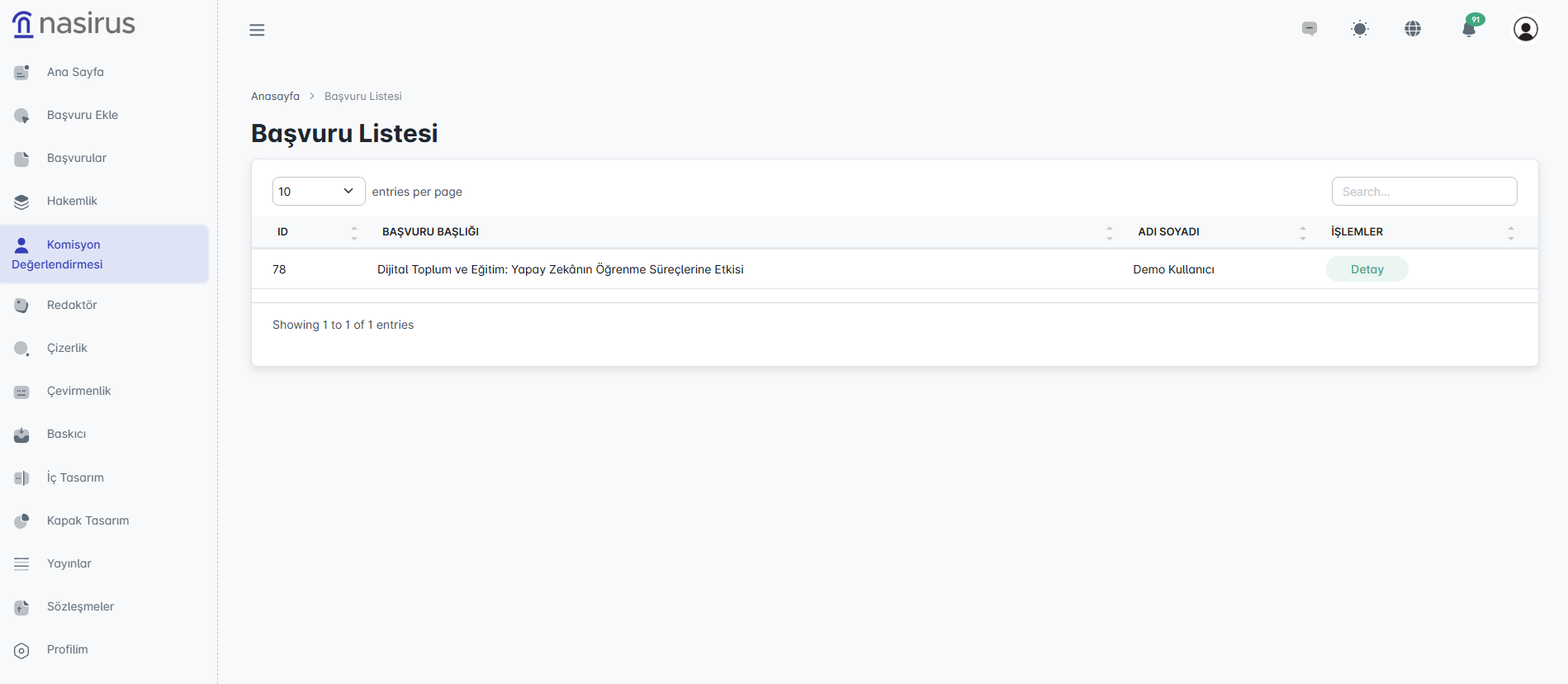 Komisyon değerlendirmesi alanı, sistemde onay sürecinden geçmiş veya komisyona atanmış başvuruların incelenip nihai karara bağlandığı bölümdür. İlk ekranda komisyon üyelerinin değerlendirmesi için kendilerine atanmış başvurular görülür. Bu listede başvurunun ID’si, başlık bilgisi, başvuru sahibinin adı soyadı ve işlem kısmında yer alan “Detay” butonu bulunur. “Detay” butonuna basıldığında komisyon üyesi başvurunun tüm detaylarına erişebilir.