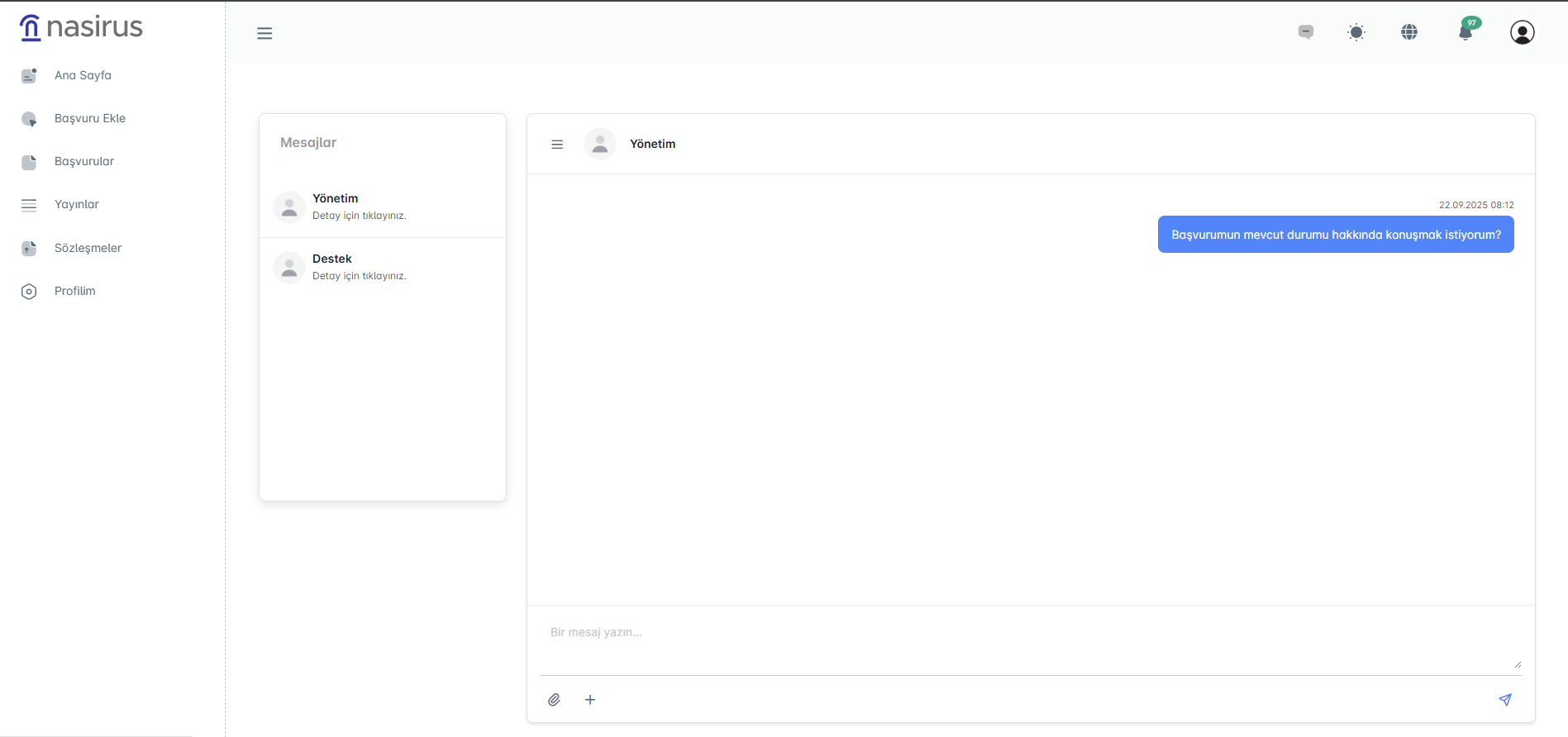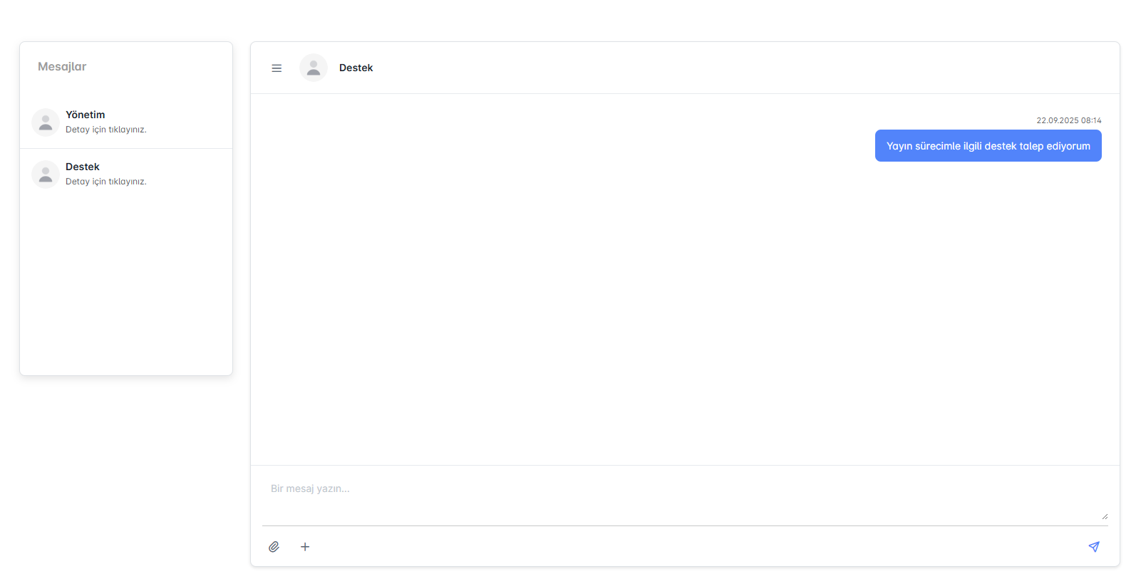 Mesajlaşma alanı, kullanıcıların sistem içindeki iletişim ihtiyaçlarını karşılamaları için hazırlanmıştır. Bu bölümde kullanıcılar iki temel kanala sahiptir: yönetim ve destek. Yönetim ile açılan mesajlarda, başvuru süreçleri, değerlendirme durumu veya yayın aşamaları hakkında doğrudan bilgi talep edilebilir. Destek alanı ise, teknik problemler, sistem kullanımı ya da genel yardım konularında kullanıcıya destek sağlamak için kullanılmaktadır.