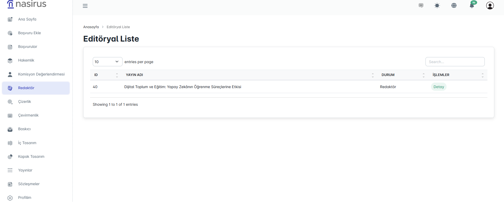 Bu ekranda redaktöre atanmış yayınlar listelenir. Yayının adı, mevcut durumu ve işlem seçenekleri görülebilir. Buradan ilgili yayının detayına girilerek düzenleme süreci başlatılır.