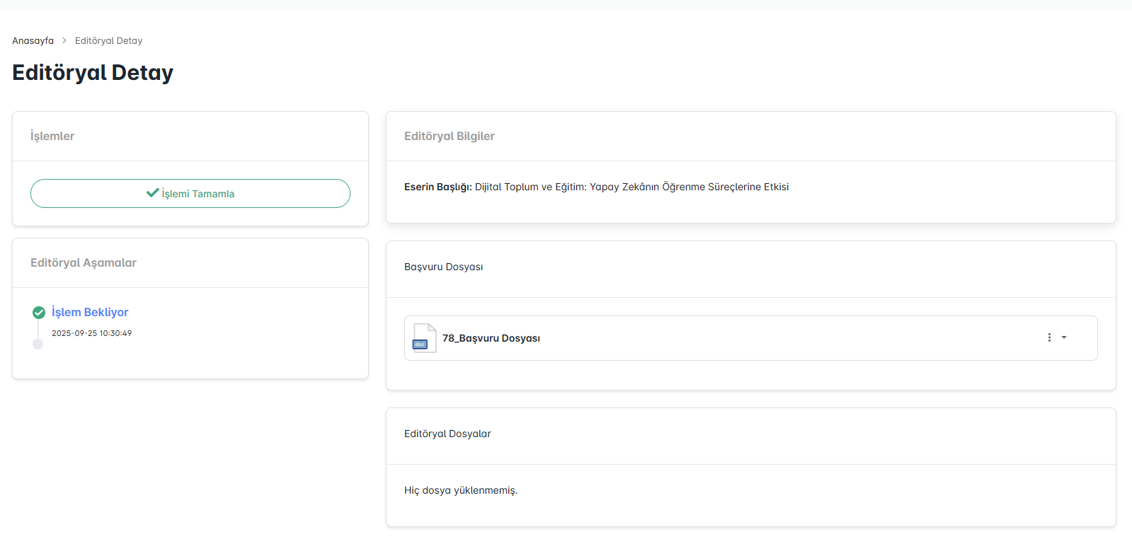 Seçilen yayının detay ekranında esere ait bilgiler, başvuru dosyası ve varsa daha önce yüklenmiş editöryal dosyalar görüntülenir. Redaktör, bu dosyayı indirerek içerik, dil ve yazım düzenlemelerini yapar. Ardından “İşlemi Tamamla” seçeneği ile süreci ilerletebilir.
