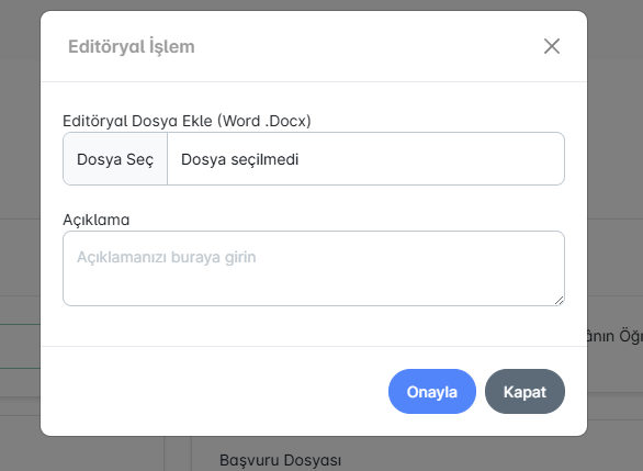 Redaktör, düzenlediği dosyayı Word formatında sisteme yükler ve ek açıklama alanına yapılan değişiklikleri veya yöneticiyi bilgilendirecek notları girer. Bu işlem, eserin akademik ve teknik standartlara uygun hale gelmesini sağlar. Dosya onaylandığında sistemde kaydedilir ve yayın sürecinin sonraki aşamasına aktarılır.